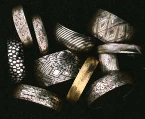 OverviewThe final finish on a mokume-gane work is what is going to make the piece pop. A fairly bland surface with little visible pattern is transformed to a strong visual element and shows the mokume off to its best advantage. There are a few general considerations. Somewhat matte surfaces show pattern (and form) better than highly polished ones. Patterned metals my have their surfaces enhanced by two main techniques, etching and patination. Etching selectively removes one metal by chemical action leaving the un-etched portion high and it gives the pattern a topography or literal texture. It will often make the surface of the deep etched component metal somewhat more matte creating a stronger visual contrast. Patina changes the color of the metal, usually by selective oxidation and can have the effect of preferential darkening one of the component metals thus increasing contrast. Copper and copper alloys, when combined with precious metals, give the strongest possible contrast because of the ability to both etch and patina the copper. Surface preparation for etchingPrecious metal/copper mokume may be finished using standard metal finishing techniques. It is best to avoid processes that can smear the surface such as heavy grinding or buffing, as this will muddy the pattern. Use processes that cut cleanly, if stock removal is required. Non-woven abrasives are excellent for this. The prep finish should be fine but not to a polish. 600 grit or 4-0 steel wool finishes are more than adequate. Hammered surfaces should be pre-finished to very clean before the final course of hammering and then pickled brushed. The surface should be degreased with soap and water, "Simple Green" or a citrus cleanser. "No-Name Patina Prep" from Reactive Metals Studio (RMS) is a dry powder that is used with water and a sponge and is excellent for both degreasing and giving the surface a light matte "tooth" that the etchant can easily work on.Areas not to be etched should be masked with fingernail polish, plastic tape or some other ground. All solder seams that are not made with gold solder should be masked. EtchingEtching may be done with 15-20% nitric acid solution, aqueous ammonia, vinegar, pickle or by reverse plating. "Multi-etch" is available from RMS and does not touch silver. In the etching of precious metal/copper mokume the copper or copper alloy will be preferentially etched leaving the silver or gold high. The apparent layer thickness of the copper will be reduced and if the work is over-etched the copper may disappear altogether. Special for gold, palladium and platinum alloys combined with sterling: Etch using a 25% to 35% nitric acid solution. Ferric chloride will etch silver but will leave it a very ugly grey that is difficult to remove. The use of aqua regia for etching is not recommended due to safety considerations. Be sure to follow proper safely procedures when working with any chemicals, especially corrosive types. Adequate ventilation is very necessary for nitric acid solutions, ammonia and Multi-Etch. Dispose of the spent chemicals responsibly, please. When etching be sure to have a neutralizing solution, usually baking soda in water, ready to stop the etch. Ideally there should be three containers, the etching solution, the neutralizing solution and a rinse solution of clean water. To etch, immerse the work in the etchant. Weak etchants such as vinegar and household ammonia may take as long as several days to reach the desired degree of etching depth while stronger etchants might take only a few minutes. It is not a good idea to leave items being etched unattended. It is important to periodically clean the surface of the object using a brush to remove oxide deposits. Some copper alloys, such as shibuichi will develop a depletion-plated skin during the etching process. When the desired depth of etch is reached, neutralize the acid and rinse. Post-etch finishingPost-etch finishing includes mild surface refinement often by lightly brushing with mild polishing compounds, a light buff to brighten the highlights or rubbing with abrasive powders to give a matt finish. Blasting with glass beads or fine abrasives will give a somewhat stronger matte surface. Plastic circular brushes with imbedded mild abrasives are very effective in refining etched surfaces. Do not to be too aggressive with the final finish, it can wipe the etch and the work will need to be re-finished. Special for gold, palladium and platinum alloys combined with sterling: karat golds combined with sterling silver often look washed out after etching. This is because some of the silver plates onto the gold during the etch. To remove the silver layer brush the items with a brush loaded with tripoli followed by a light buff using hard felt and white rouge. Very light hand sanding with a fine paper can also remove the silver plating layer. After the silver layer is removed, proceed to creating the final surface finish. karat golds combined with sterling silver often look washed out after etching. This is because some of the silver plates onto the gold during the etch. To remove the silver layer brush the items with a brush loaded with tripoli followed by a light buff using hard felt and white rouge. Very light hand sanding with a fine paper can also remove the silver plating layer. After the silver layer is removed, proceed to creating the final surface finish. PatinaPatina is the final step. Most copper alloys will color by handling but if a faster or more specific color is desired, two patina solutions work well. "Baldwin's Patina" will color most copper alloys (except brass and nickel silver) and will not color silver or gold. Rokusho, a traditional Japanese simmering patina gives different colors including a striking brick red/orange on copper. It is available from RMS. Heat colors on copper, produced by oven baking from 300 F to 550 F. can be striking, Special for gold, palladium and platinum alloys combined with sterling: few patin
